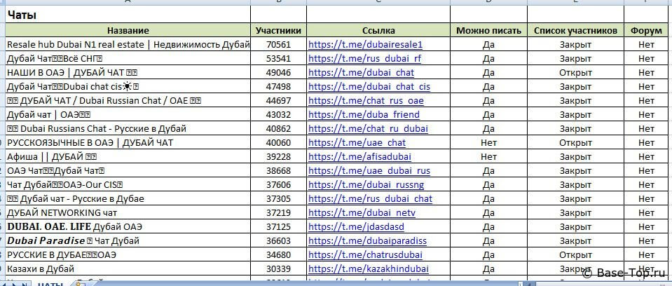 В базе попадаются чаты / каналы в основном города Дубай, но могут попадаться иногда города Абу-Даби, Шарджа, Аджман, Умм-аль-Кувейн, Рас-эль-Хайма, Фуджейра, Корнейшн, Масафи, Калиба аль-Шаркия, Мадинат Заид, Бурдж Халифа.