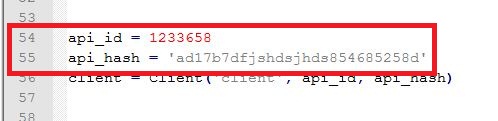 Открываем файл Bot.py в редакторе, таком как Notepad++ или Visual Studio Code. На 54 - 55 строке вводим свои API_ID и API_HASH. И сохраняем файл.