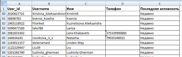 Скрипт для сбора подробной информации об участниках из чатов Telegram. Результаты сохраняются в файл Microsoft Excel (*. xlsx) в котором указаны: ID пользователя, Usrename, Имя, Когда был онлайн, Телефон (если не скрыт). В файле будут три вкладки: Все пользователи, Обычные, Премиум.
