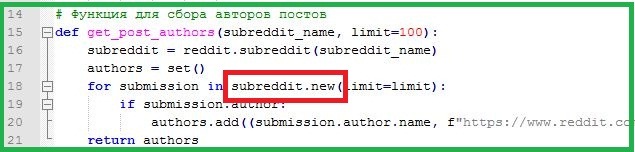 По умолчанию скрипт собирает авторов с новых постов (New). Можно поменять чтобы собирались комментаторы с ТОП-постов (Top), или горячих (Hot). Для этого на 18 строке нужно заменить значение subreddit.new на subreddit.top или subreddit.hot соответственно.