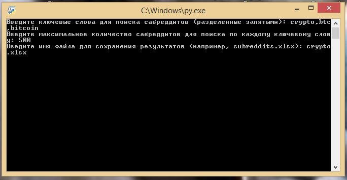 Скрипт запросит у вас ключевые слова для поиска сабреддитов, максимальное количество сабреддитов для вывода, и имя файла для сохранения результатов. Затем он выполнит поиск и выведет список найденных сабреддитов. Ключевые слова нужно вводить через зарятую, без точки в конце.