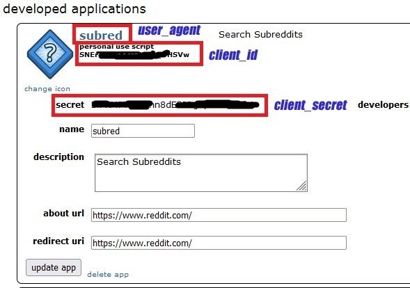 2. Вставьте свои client_id, client_secret и user_agent в соответствующие переменные в скрипте reddit.py (66-68 строки). Например открыв файл через Notepad++.